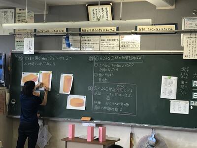 ( ↓ 箱を使って、算数の立方体の授業です。)