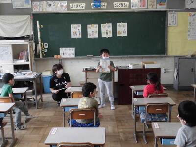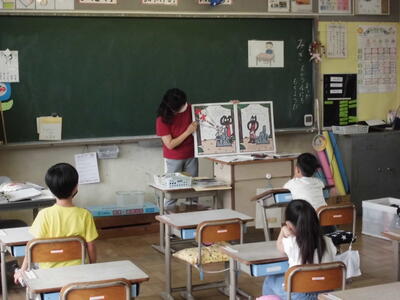( ↑ 教科書のイラストを見て、自分が見つけたことを発表しています。)