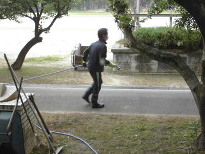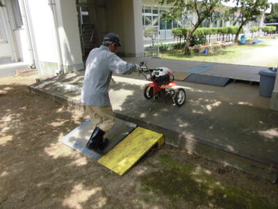 ↓ 校務員さんが、学校の菜園の除草や土おこしをおこなってくれています。このあと、学年ごとに作物を育てます。