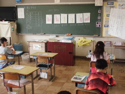↓ 今日の授業。4年生がグラフの読み方を学習しています。自分が気がついたことをプリントにまとめています。