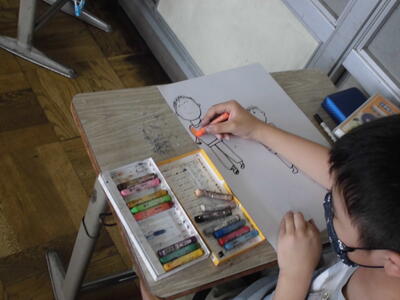 ↓ 2年生が、図工でペンで絵を描いています。「好きなこと」や「見たこと」を描き、きれいな色でぬっていきます。