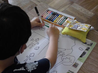 ( ↑ 学校と自分の住んでいる地域の地図を作成しています。)