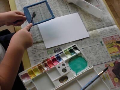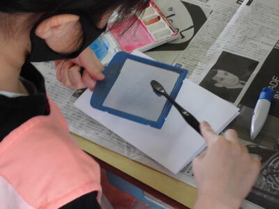 ↓ 4年生の図工では、ブラシとアミを使って絵の具を霧状に吹き飛ばして作品を作っています。