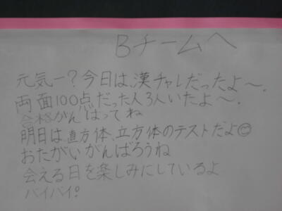 『みなさん、元気ですか?明日はいよいよチャレンジテストだよ。みんな、がんばってください。』『元気ー?明日は立方体のテストだよ。おたがい、がんばろうね。』『会える日を楽しみにしているよ』などのメッセージを交換しています。