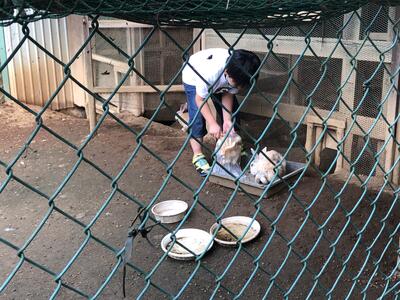 ( ↓ 2年生の当番さんによるウサギ小屋の世話。)