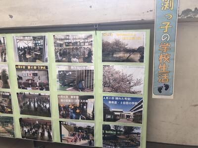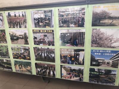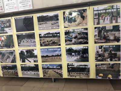 ( ↓ 学校の掲示物。職員室前の廊下には、今年度の学校の歩みが、写真で示されています。来校の際には、ご覧になって下さい。)