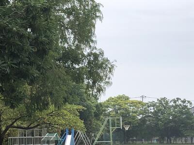 ( ↓ 写真は昨日の午後の学校。空は晴れわたり、木の間からはセミの鳴き声が響いています。)