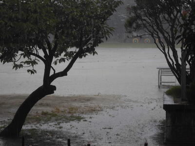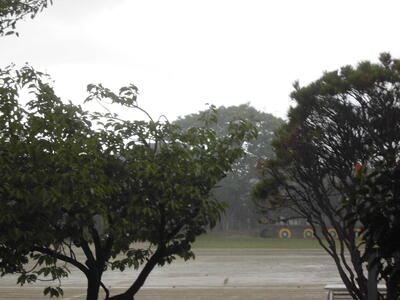( ↓ 10:40 かなり激しい雨がたたきつけるように降ってきました。風も強く、木の葉も舞っています。)