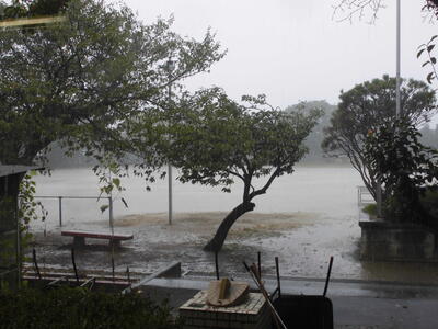( ↑ 校庭には水たまりが出来ていますが、空は晴れ、樹上ではセミが鳴いています。)