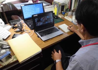 学校内でも、パソコンやタブレットを使用して、リモートでの遠隔会議をおこなっています。本日は、校長室にて校長先生が、他校の校長先生方とリモート会議をおこないました。タブレットでオンライン・ミーティングのアプリケーション・ソフトを使用して、遠方に出向くことなく会議や情報交換が進んでいます。