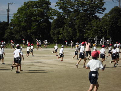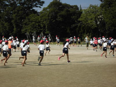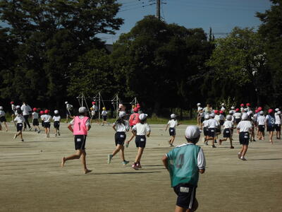 本日の朝は全校運動の時間「さわやかタイム」です。自分自身の体力向上や運動会を目標に、子供たちは元気に校庭を走っています。