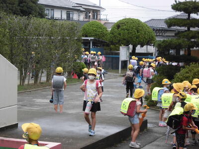 本日も、一日、天候が不安定でした。急に暗くなって、突然強い雨が降ってきたり、やんで晴れ間が見えたりと、変化が激しい一日でした。下校時間帯の強風や雷雨を心配しましたが、さいわい下校時間には晴れ間が出て、雨も降っていなかったので、子供たちは安全に下校しました。(写真は下校時の様子)