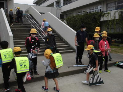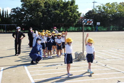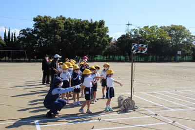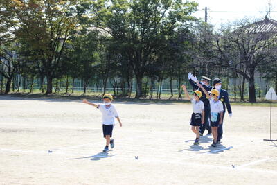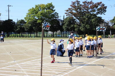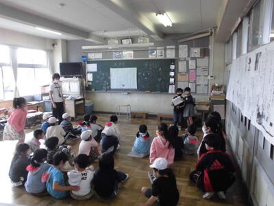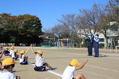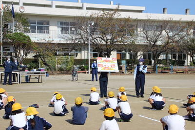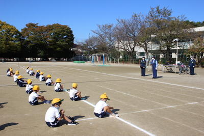 ( ↓ 一年生の交通安全教室。左右をよく確認して、車に気をつけて横断歩道をわたるよう教わりました。)
