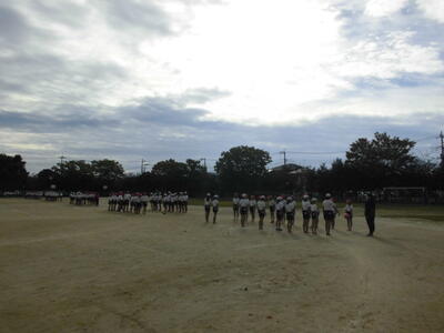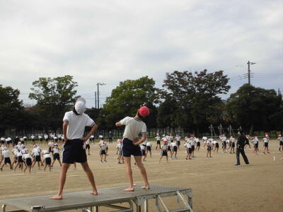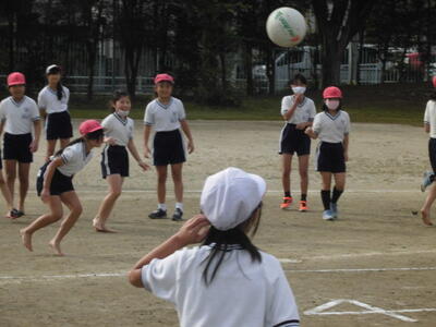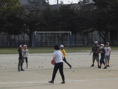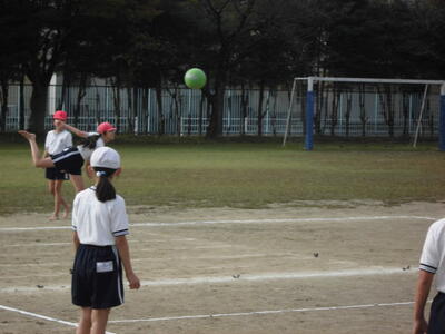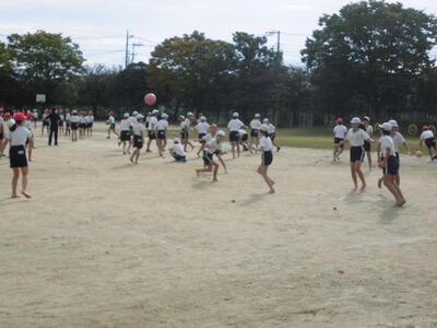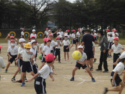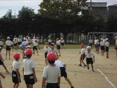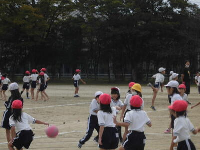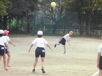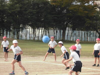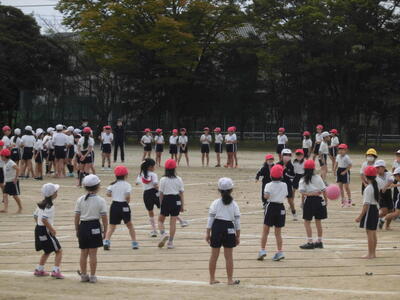 本日の朝は体育朝会です。全校でドッジボール大会をおこないました。学年ごとに12個のコートでおこない、短時間でしたが、子供たちは元気に参加しました。