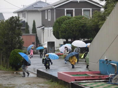 本日、第三土曜日は授業日です。冷たい雨の朝となりましたが、子供たちがカサをさして登校しています。