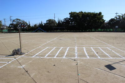 ( ↓ 昨日のうちに、先生方で校庭に車道や横断歩道をあらわす線をひきました。小渕小の校庭に、交差点と横断歩道が出現しました。)