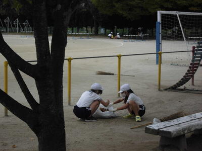( ↓ 前回は雨のため外で活動できなかった校庭のグループでしたが、今日は一生懸命に落ち葉などを集めていました。)