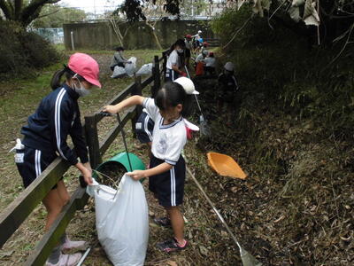 4年生が、総合的な学習の時間で小渕小の環境を調べています。その学習の一環として、自分たちで環境をきれいにしようと、本日も前回に続いて、校庭の樹木の落ち葉掃きや、自然の森の水路の清掃などをおこないました。