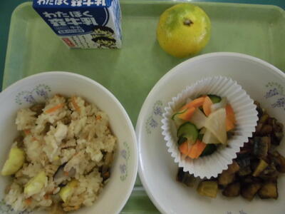 10月5日の給食は、秋の香りごはん、牛乳、さんまとさつまいもの甘辛、即席漬け、みかん、でした。