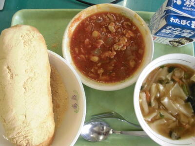 10月6日の給食は、きなこ揚げパン、牛乳、とり肉のトマト煮、ワンタンスープ、でした。