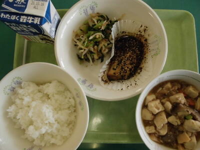 10月7日の給食は、ごはん、牛乳、さばの南部焼き、おかか和え、豆腐とひき肉の煮込み、でした。