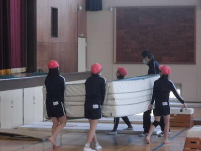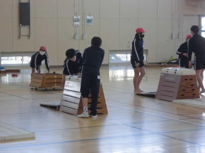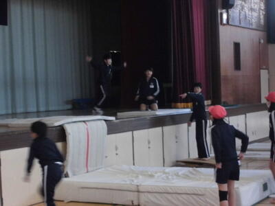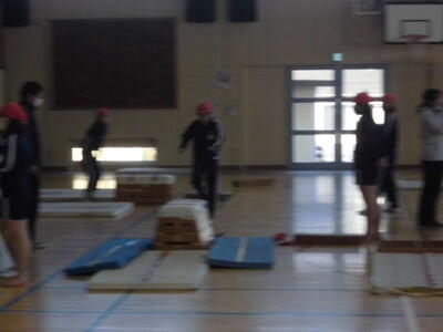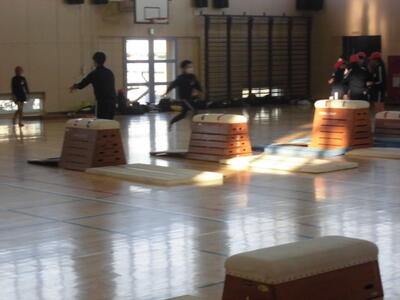6年生の体育の授業です。体育館で跳び箱に取り組んでいます。