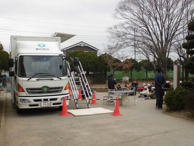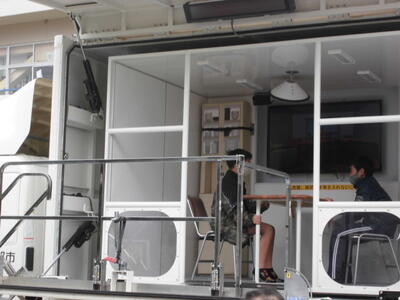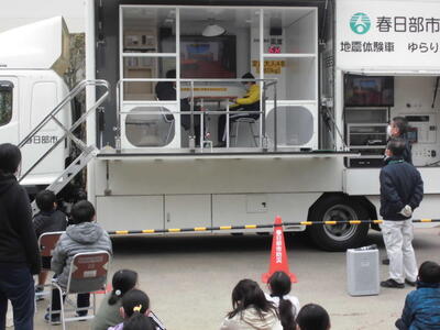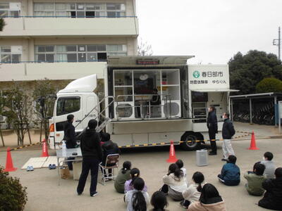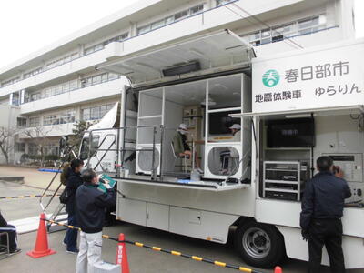 本日、春日部市の起震車が来校し、震度6などの地震の揺れを体験しました。(感染症予防のため、起震車には少人数で、また乗車前後にはアルコール消毒をおこなうなど、対策を徹底して実施しました。)