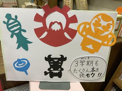 学校内には、新年や一月をイメージした掲示物が多く見られます。