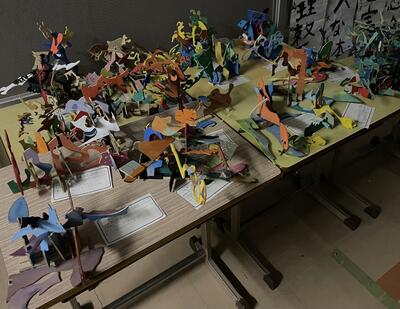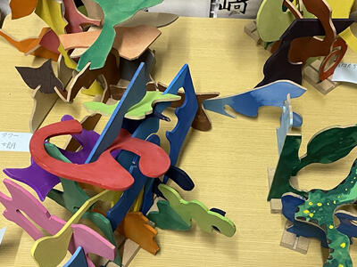 保護者の方や地域の方に来校いただく機会ができませんので、このホームページ内でも学校内の様子をお伝えします。(今回は、5年生の廊下の図工の作品です。木をいろいろな形に直線や曲線で切って組み合わせ、それぞれが個性のあるオリジナルの作品を作り上げています。)