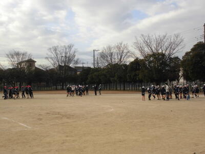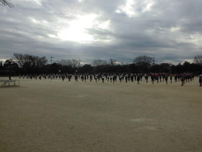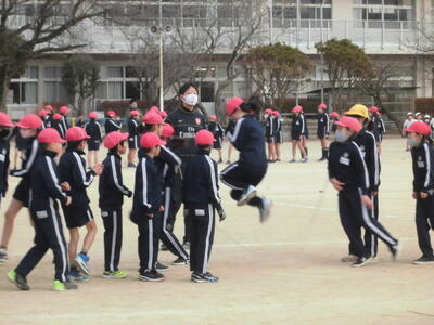 今日の朝は体育朝会でした。この時期は、クラスごとに長縄とびに挑戦しています。