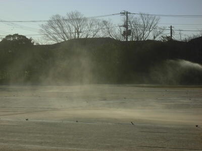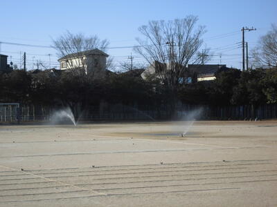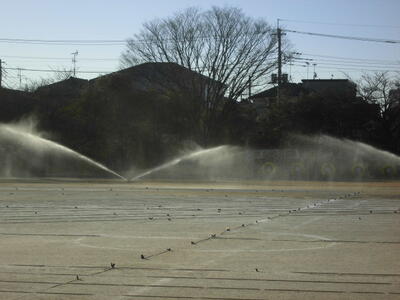 風が強く、校庭の土が舞うので、本日はスプリンクラーを作動させました。