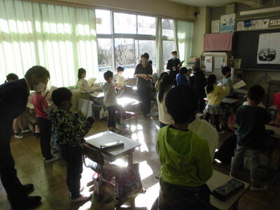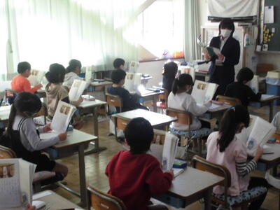 ↓ 1年生は国語の時間です。教科書の『たぬきの糸車』を読んで、自分の考えを発表しています。音読は、みな大きな声で上手に読めるようになってきました。