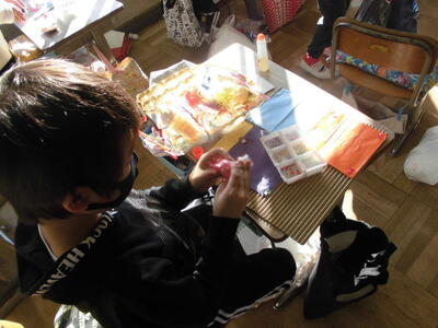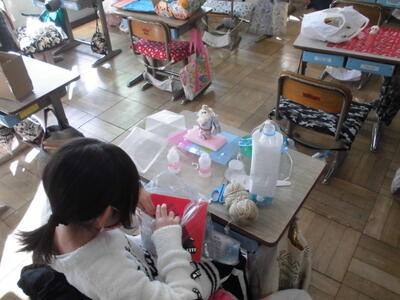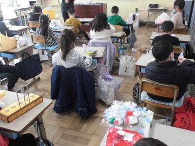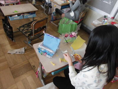 ↓ 2年生の図工、『ピコリン星の夢のステージ』の単元です。各自が持ち寄った材料(色紙やシール、透明容器など)で思い思いのステージを作り上げています。