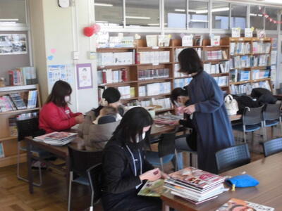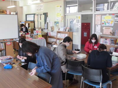 毎週、木曜日に、図書ボランティアさんが活動してくださっています。今日は新刊の装丁や、図書室の飾り付けをおこなってくださいました。
