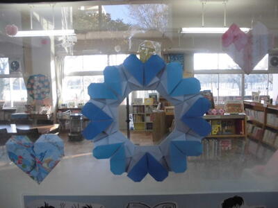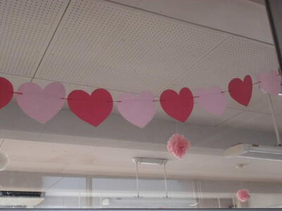 ( ↓ 2月をイメージして、たくさんのハートが飾ってあります。)