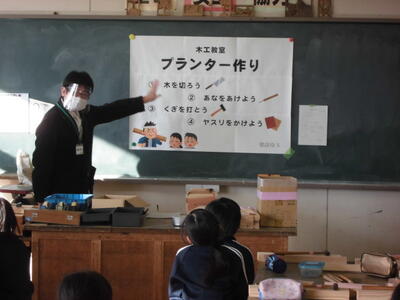 本日、外部から講師の方をお招きして、3年生の木工教室がおこなわれました。講師の方に教えたいただき、のこぎり・金づち・きりなどを使いながら、それぞれがプランターを作っていきます。