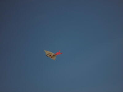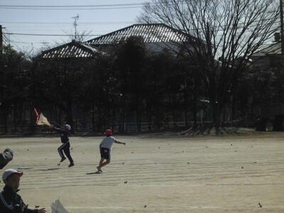 一年生の生活科の時間です。自分たちで作った凧をあげて、風の流れを勉強します。