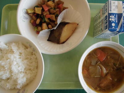 8日の給食は、ごはん、牛乳、青ヒラスのみりん醤油漬け焼き、大豆の五色煮、田舎汁、でした。