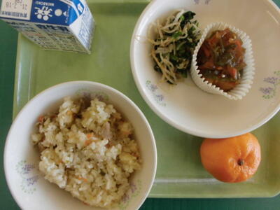 9日の給食は、ぶた肉とねぎ塩の混ぜごはん、牛乳、生揚げの野菜あんかけ、青菜のナムル、ぽんかん、でした。