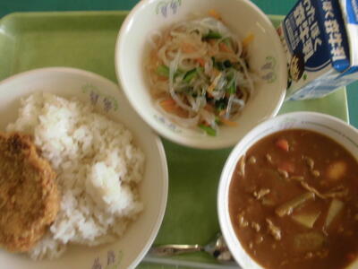 10日の給食は、根菜カレー(麦ごはん・ルウ)、カツ、牛乳、春雨サラダ、でした。