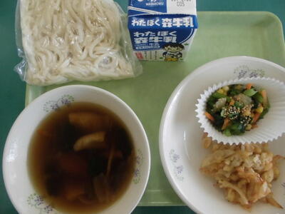 今日の給食は、きつねうどん(地粉うどん・汁)、牛乳、ごぼうと桜エビのかき揚げ、青菜のごま醤油あえ、でした。