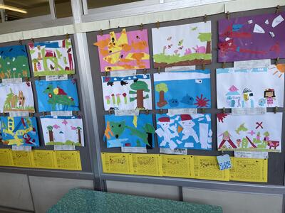 一年生の廊下に、子供たちの作品が飾ってあります。色紙をちぎって手にしたちぎり絵です。各自が、いろいろなテーマで、思い思いの絵を作っています。