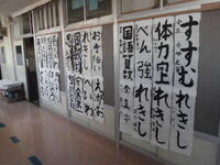 3年生の廊下の掲示を紹介します。習字で、三学期に頑張りたいことを書いています。