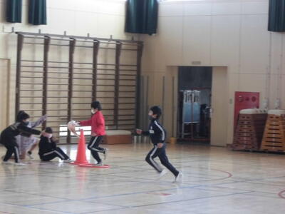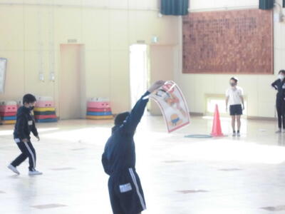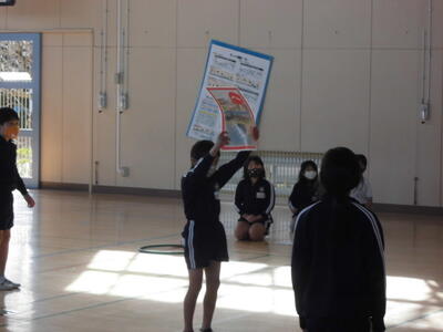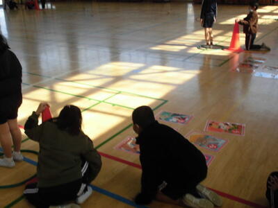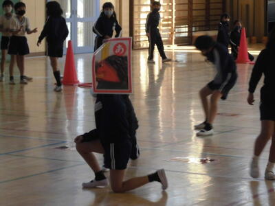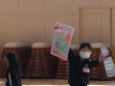 3年生が郷土の学習で、春日部市の郷土かるたで学習をします。かるたは密になってしまうので、本日は、春日部市教育委員会が作成したジャンボかるたで、かるた大会をおこないました。教育委員会の方を講師にお招きして、体育館いっぱいに広げたジャンボかるたを、3年生がチームに分かれて競いました。