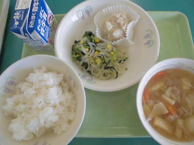 7日の給食は、ごはん、牛乳、鮭の塩焼き、ごま酢和え、鶏肉と野菜のうま煮、でした。