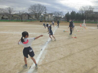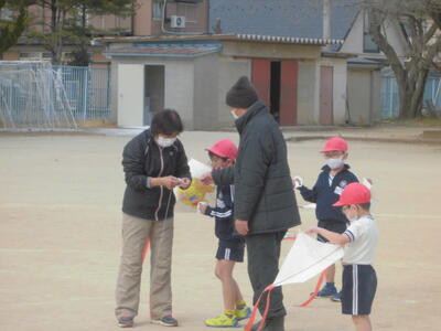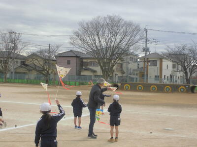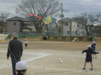 4時間目は校庭に出て、自分の作った凧をあげてみました。
