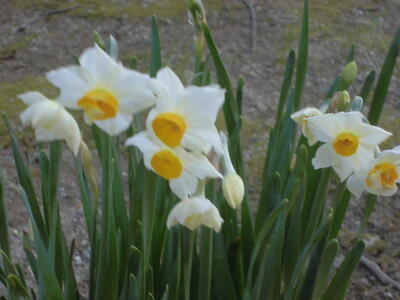 学校では、スイセンがきれいに咲いています。北風に揺れています。