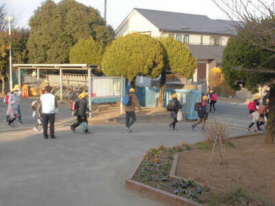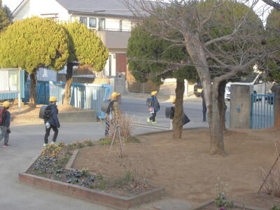 ( ↓ 午後の一斉下校・「交通安全ボランティアさんへのお礼の会」。校庭に広がって、日頃、登下校を見守っていただいている交通安全ボランティアさんに感謝の気持ちを伝えました。)