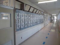 学校の玄関を入ってからの廊下は、「小渕っ子ギャラリー」の名前がついています。図工や書写の作品が展示されています。今の時期は、書きぞめの埼玉県展覧会に出展された作品が掲示されています。