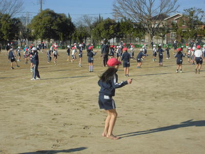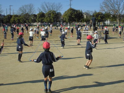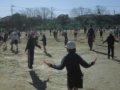 本日の朝は、さわやかタイム。全校で運動の時間です。全員で走るのは密になってしまうので、今日は、校庭でじゅうぶんに児童間の感覚をあけて、マスク着用で縄跳びをおこないました。